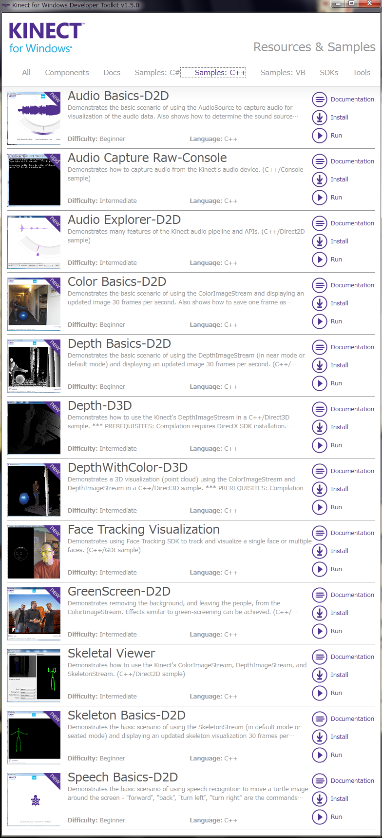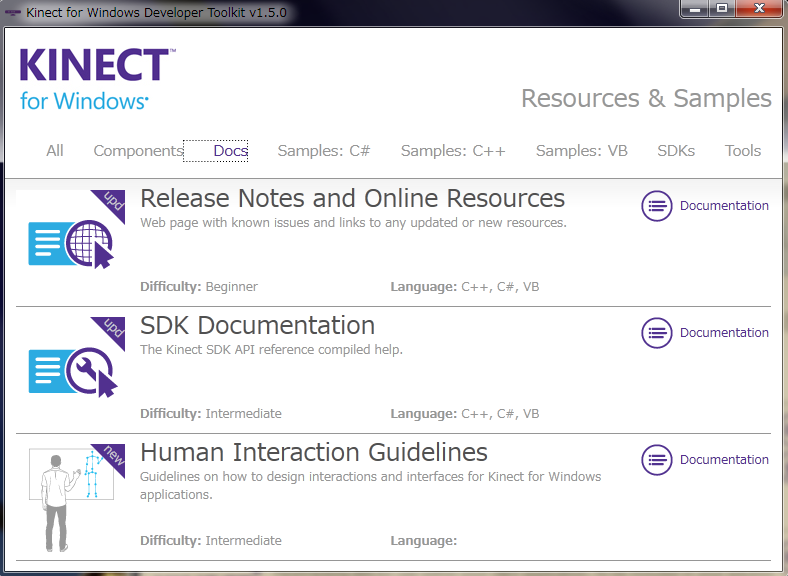 Developer Tool BrowserはSDKを使って開発するための各種ドキュメントやサンプル・プログラム,そのソースコードなどを簡単に参照できます.SDK1.5で提供される情報はSDK1.0から大幅に追加されており,そのままでは量が多いため,メニュー上部のカテゴリ別に分けて参照するのが便利です.ドキュメント類を参照する場合,基本的にMicrosoftへのリンクなのでインターネットへの接続が必要です.
