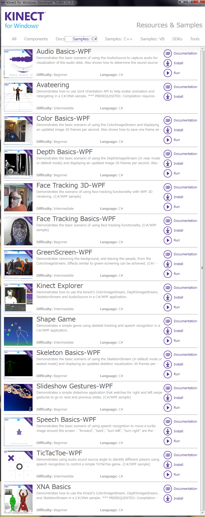非常に多くのC#のサンプル・プログラムがあります(図8).Runボタンがあるサンプルはそのまま実行できます.各項目には,Beginner(初級),Intermediate(中級)といった難易度が示されています.