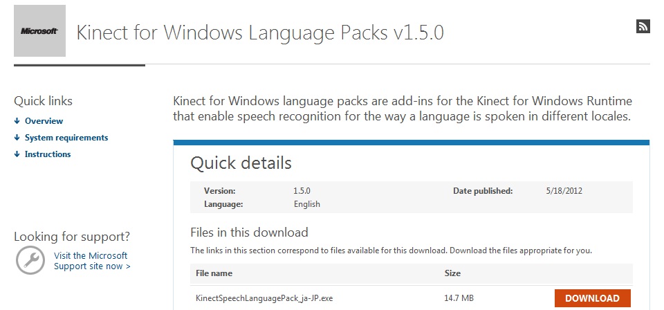 英語の音声言語パッケージはKinect for Windows SDK 1.5のインストール時に一緒にインストールされますが,日本語に対応させるには日本語用の音声言語パッケージを別途入手する必要があります.
