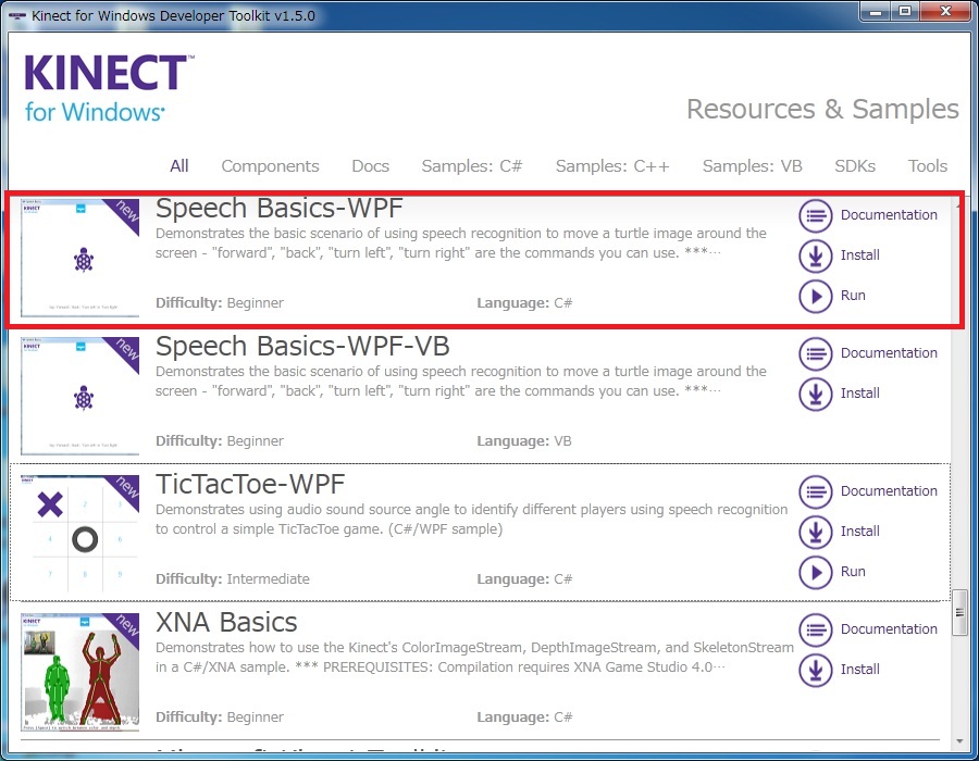 まず,Kinect for Windows Developer Toolkit v1.5.0を開き,「Speech Basic-WPF」の右にあるアイコン「Install」を選択して,このサンプル・プログラムのソースコードをローカルディスクの指定した場所にコピーします.