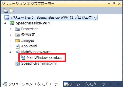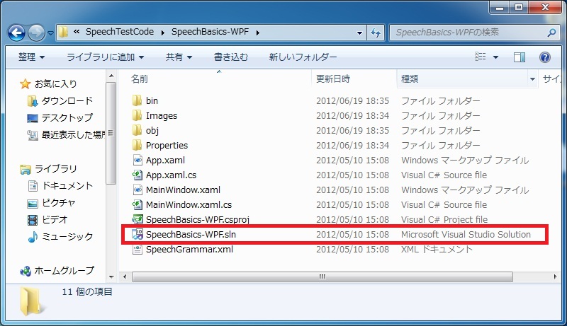 つぎに,サンプル・ソースコードをコピーしたフォルダを開き,ソリューションファイル(図10のSpeechBasics-WPF.sln) をダブルクリックするとVisual Studio2010が起動します.